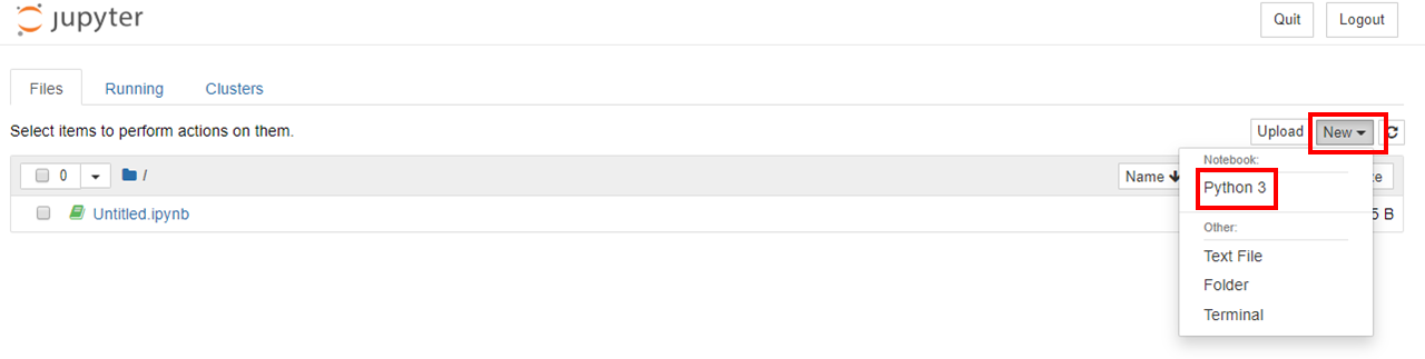 실행이 완료되면 브라우저에서 자동으로 Jupyter Notebook이 실행됩니다. 테스트를 위해, 아래 그림처럼 New를 선택해 Python3를 클릭하면, local C드라이브의 code 폴더에 Untitled.ipynb가 생성된 것을 확인하실 수 있습니다.
