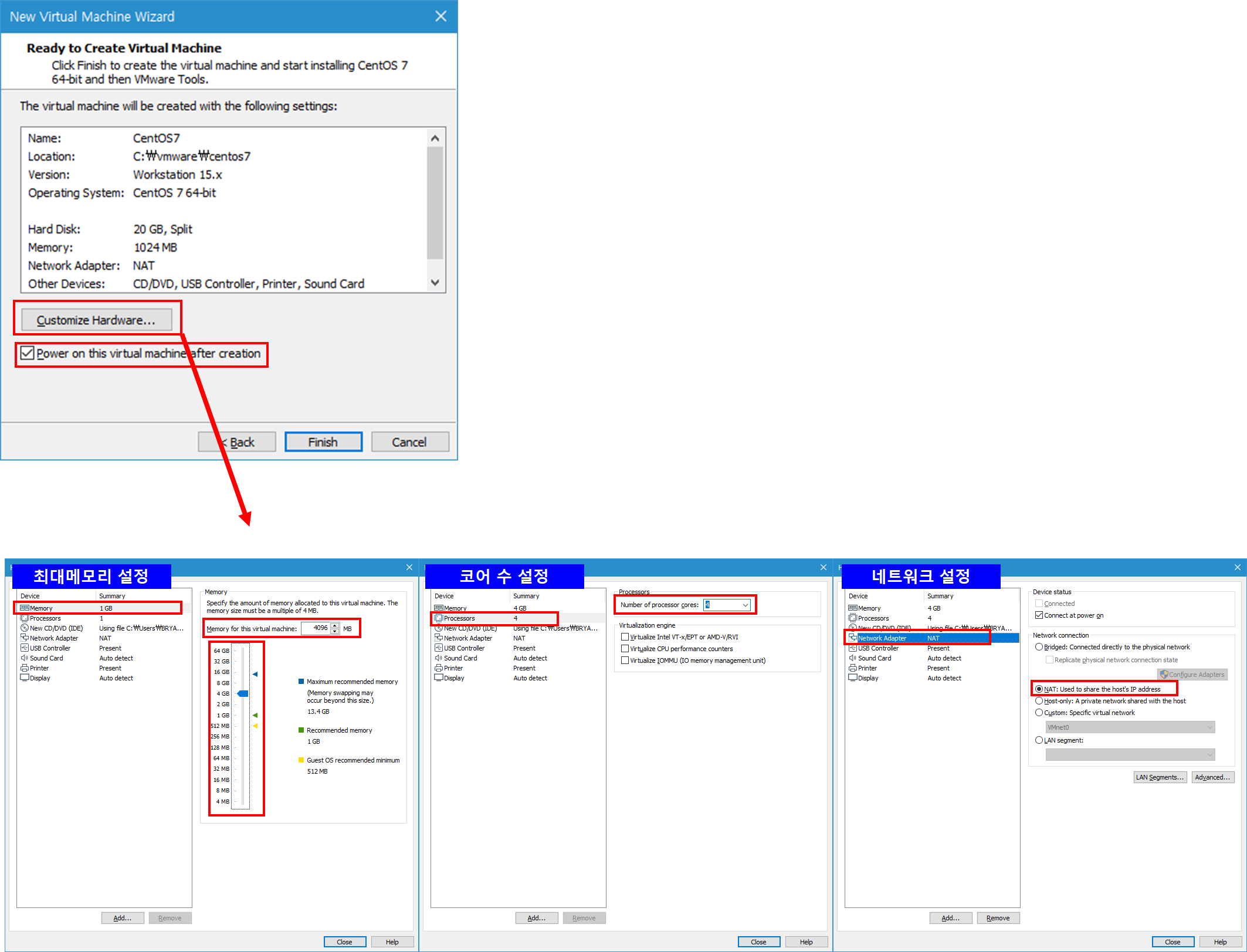 - VMwaore Workstation Player가 실행되면 Create a New Virtual Machine을 클릭합니다. 그리고 아래 그림과 같은 순서로, CentOS7 iso 파일을 불러오고 계정설정, disc size 설정을 마칩니다.
