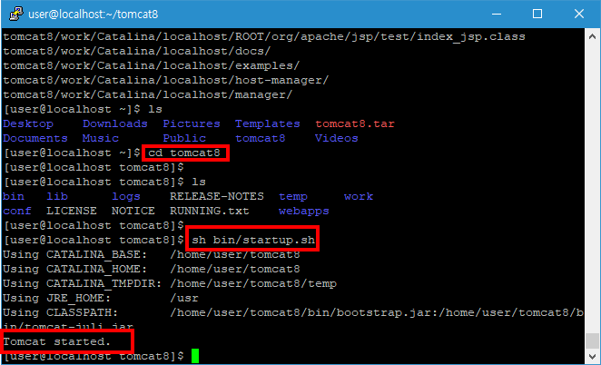 2) 압축해제된 tomcat8 디렉토리의 tomcat binary 실행