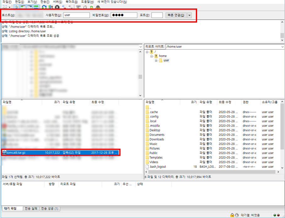 1) Local PC에 저장된 Tomcat 파일을 FTP를 통해 가상서버로 전송