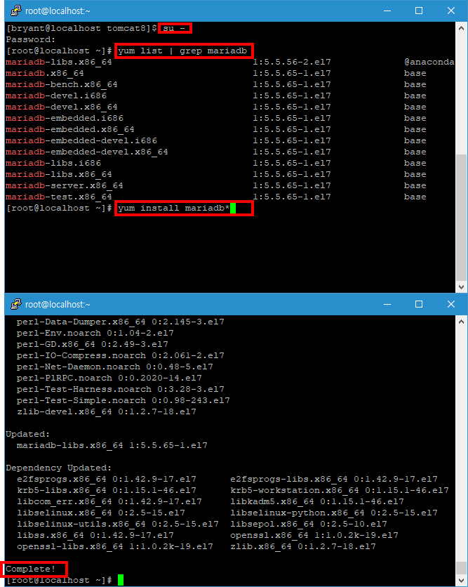 - 설치 중 [y/n] 문구가 나오면 y를 선택하고, 설치 완료 후 Complete! 확인