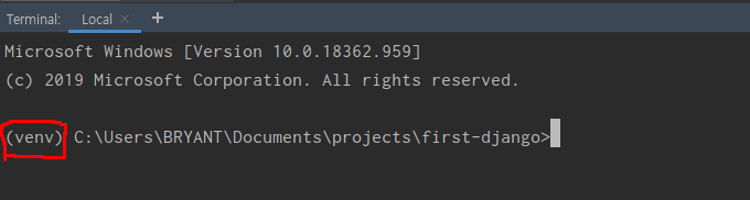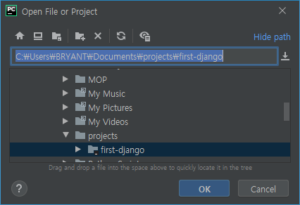 (1) Pycharm 실행 후 cmd에서 만든 project를 그대로 open