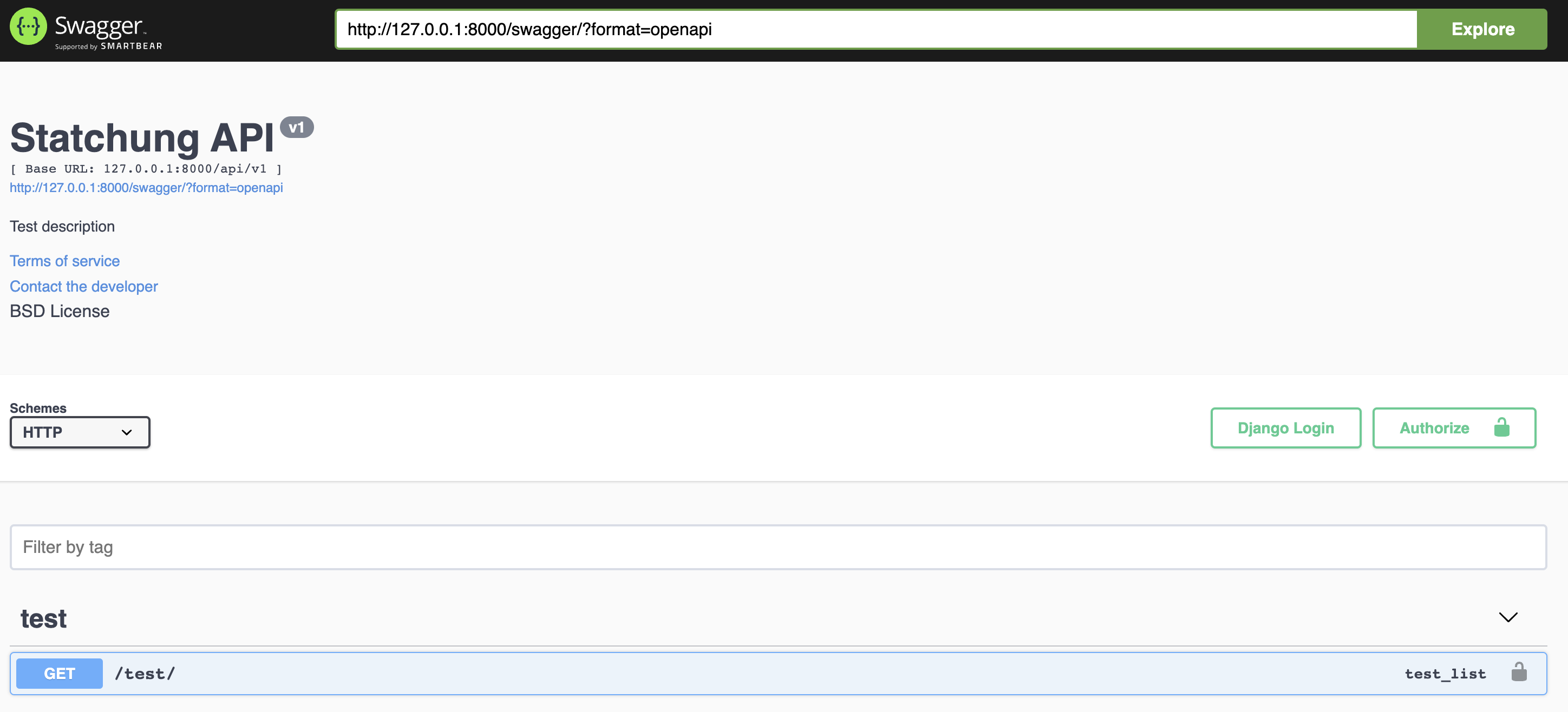 Chrome 브라우저 주소창에 http://127.0.0.1:8000/swagger/ 를 입력하여 아래와 같이 위에서 생성하고 설정한 Test API가 정상적으로 나타나는지 확인합니다.