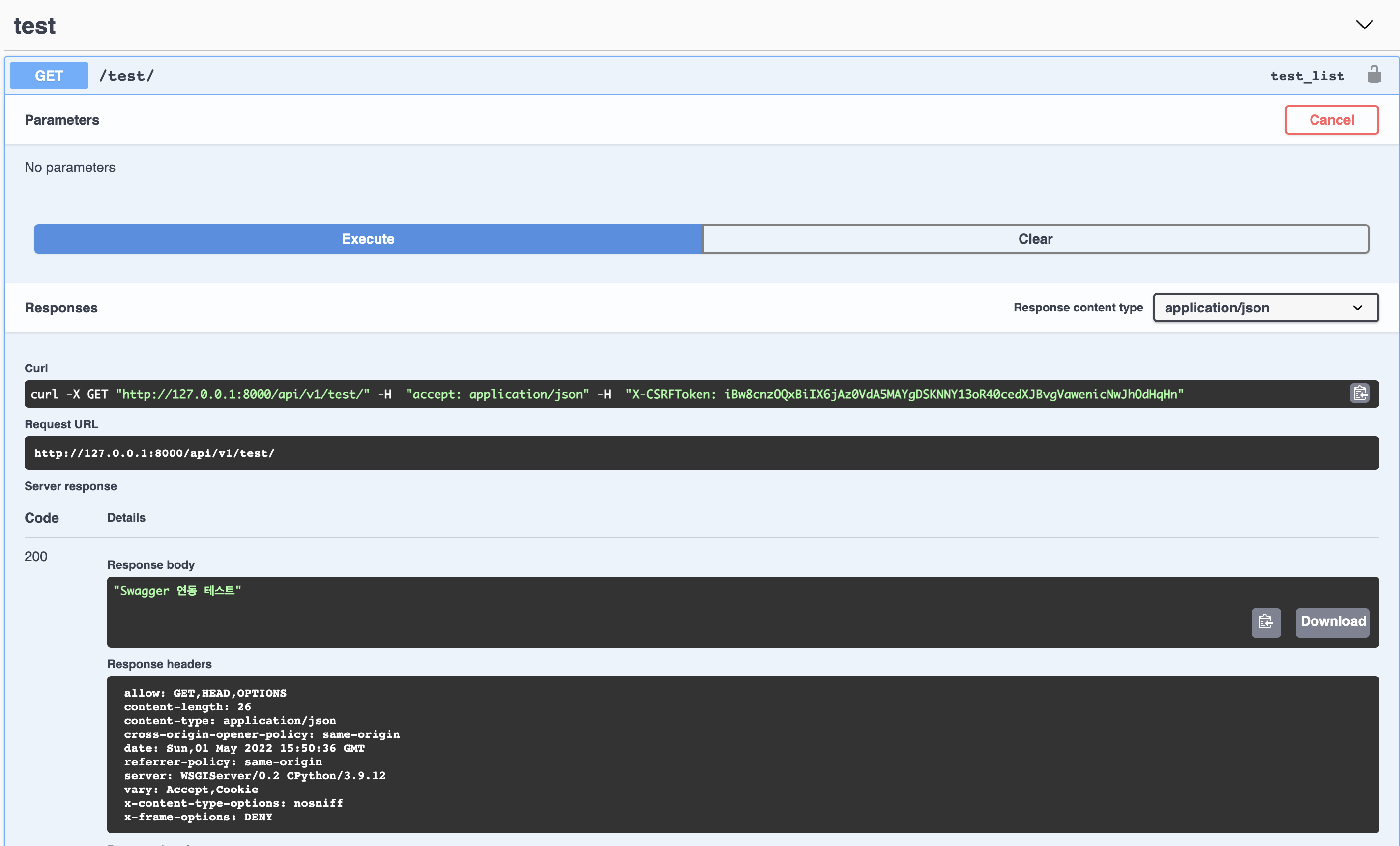 우리가 TestView에서 작성하고 urls.py 설정한 GET 방식의 /api/v1/test/ API를 확인 할 수 있습니다. 그리고 아래와 같이 Try out을 통해 API를 실행 할 수 있습니다. Response Body를 보시면, status code 200 과 "Swagger 연동 테스트"를 제대로 Response하고 있있습니다.