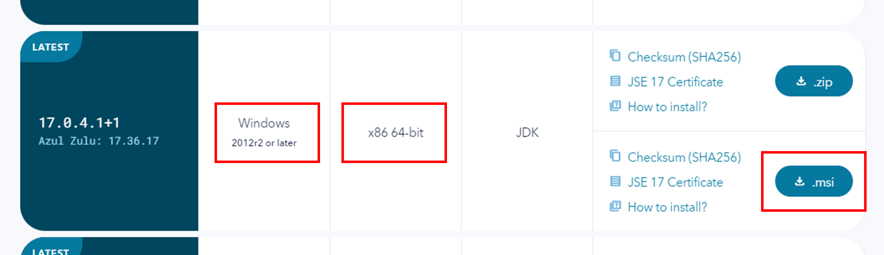 아래 링크에서 사용하는 OS에 적합한 JDK를 설치합니다. 저는 'LTS' 키워드로 검색하여 2022년 10월 14일 기준 가장 최신 버전인 Java 17버전을 선택하였고, Windows 환경의 Intel CPU를에 맞는 .msi 파일을 다운로드 받아 설치를 진행했습니다. 설치경로는 'C:\Program Files\' 입니다.