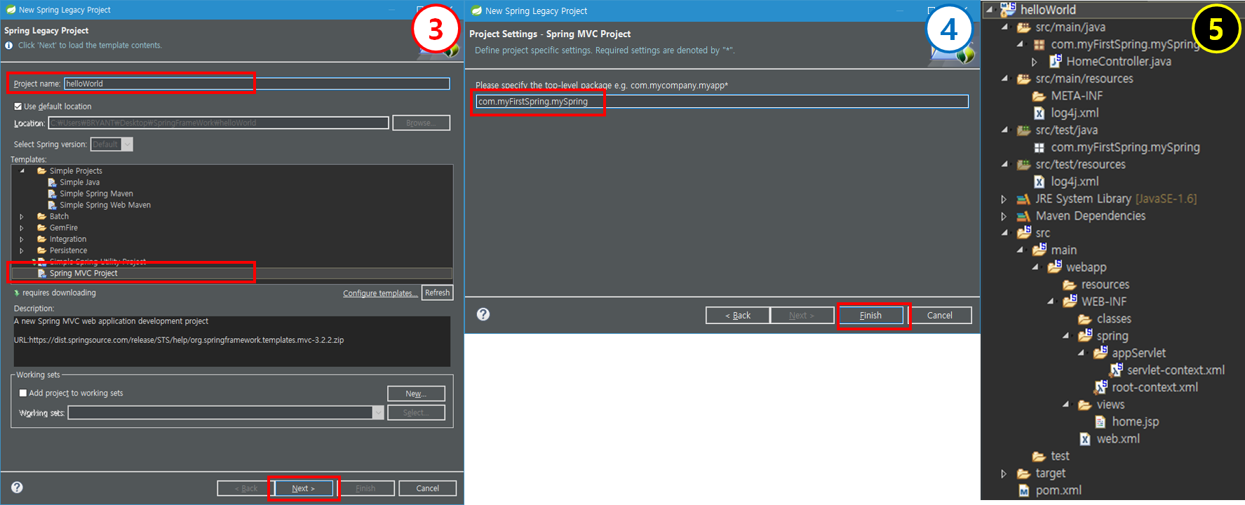 Project명을 입력하고 spring MVC project를 선택 (그림 3 참고)한 후,