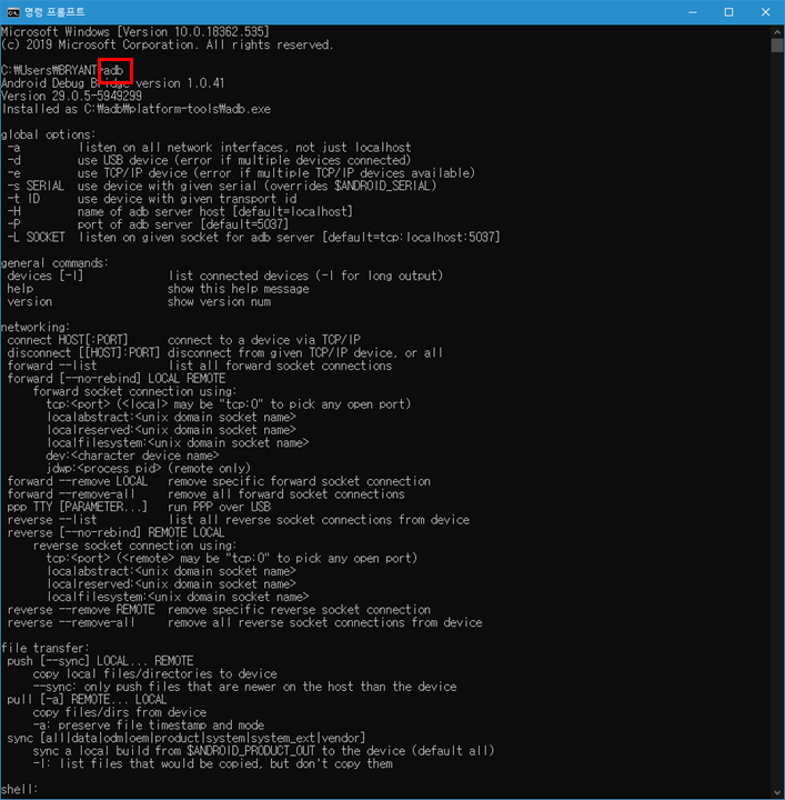 띄운 후 adb 명령어를 입력하면 아래 그림과 같은 메시지가 나옵니다.