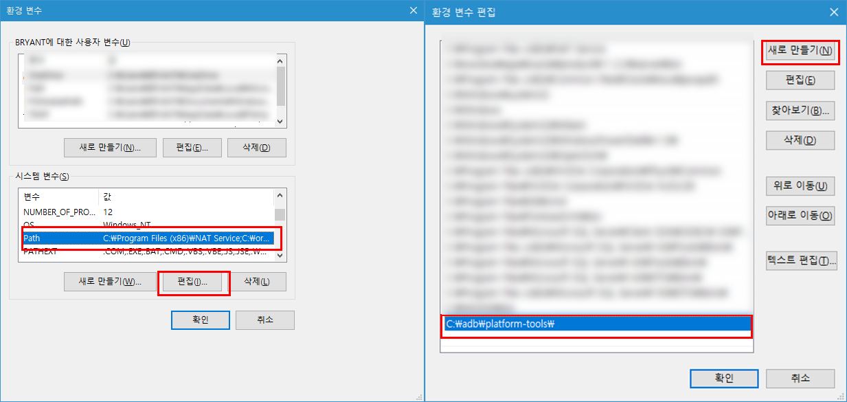 4) 새로만들기를 클릭하고 adb를 설치한 폴더의