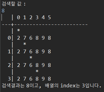 배열의 선형검색 과정을 console창에 출력하는 프로그램을 만드는 것인데요. 저는 나름대로 한 번 더 생각하기 위해서 보초법을 활용하는 과정을 출력하고자 합니다. 선형검색과 관련된 내용이 숙지가 안되신 분들은 아래링크를 통해, 먼저 학습하고 오시면 이해가 빠르실거라 생각됩니다.