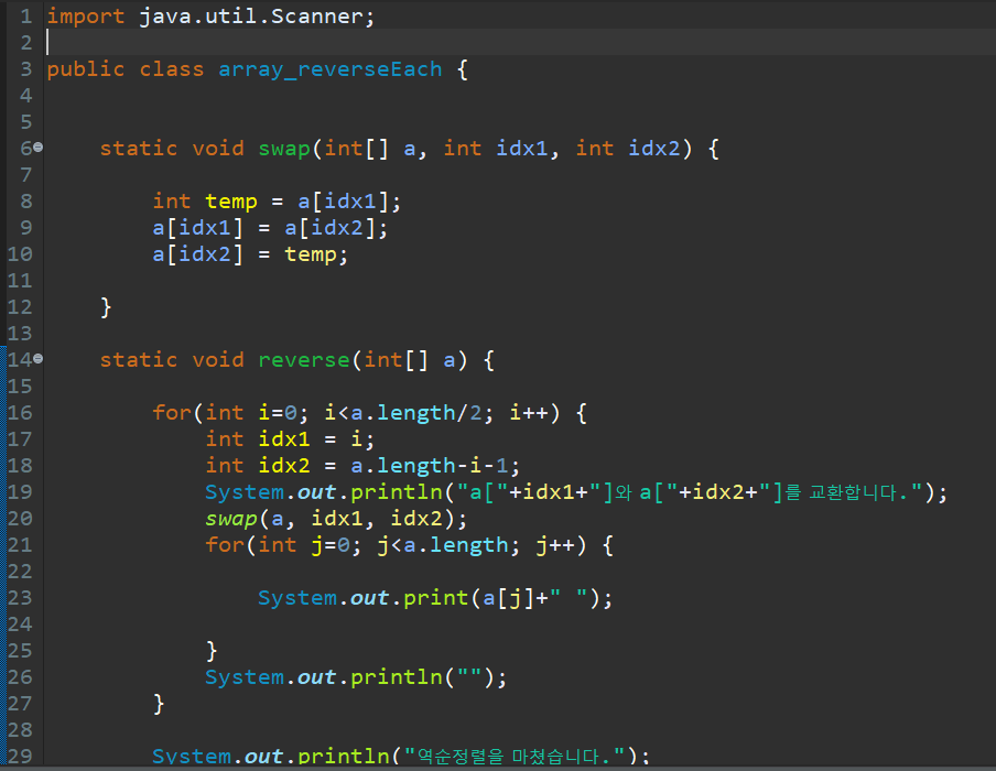 본 포스팅은 'Do it! 자료구조와 함께 배우는 알고리즘 입문 Java편'을 스터디 한 내용입니다. 1. 배열의 역순 정렬은 요소 교환이 총 n/2회 필요함. 1) x값을 t에 보관 2) y값을 x에 대입 3) t에 보관한 처음 x값을 y에 대입 static void swap(int[] a, int idx1, int idx2) { int t = a[idx1]; a[idx1] = a[idx2]; a[idx2] = t; } 2. 배열을 역순으로 정렬 배열의의 이름이 a이고 크기가 5라면 역순정렬을 위해서는 (a[0], a[4]), (a[1], a[3]), a[2]의 쌍으로 교환이 되어야 한다. for문을 활용한다면, i=0부터 시작해서 배열길이의 절반(a.lenght/2)만큼 반복되어야 한다. static..