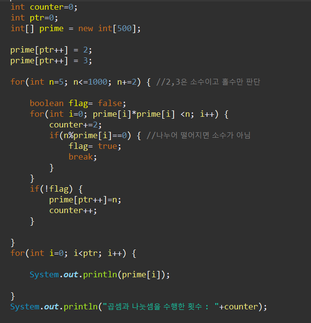 본 포스팅은 'Do it! 자료구조와 함께 배우는 알고리즘 입문 Java편'을 스터디 한 내용입니다. 방법 1, 2, 3으로 진행되면서 나눗셈 횟수를 줄이는 방향으로 알고리즘을 개선함. 방법 1. 2부터 n을 1씩 증가시키며, 그 값이 소수인지 판단함. 이중 for문의 안쪽에서 n까지 i를 1씩 증가시키면서 나누어떨어지면 break;를 통해 반복문을 탈출함. 그동안 counter++되면서 나눗셈 횟수를 증가시킴. 짝수 및, 소수의 배수들 또한 반복적으로 테스트함으로 불필요한 나눗셈 횟수가 많아짐. /** * @Date 2020. 1. 26. * @Time 오후 4:03:00 * @author BRYANT * ===================== * Writing Developer */ public cl..